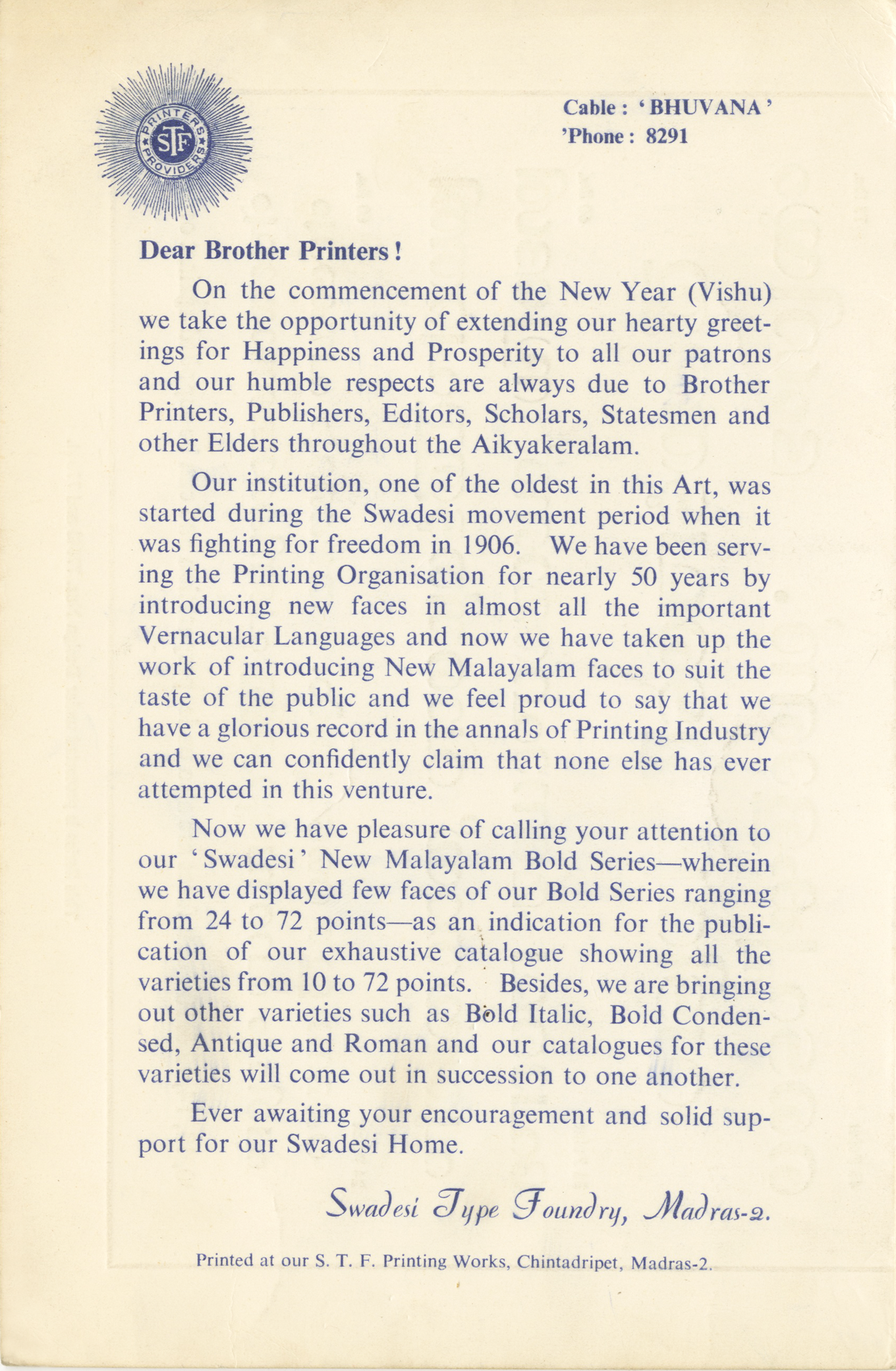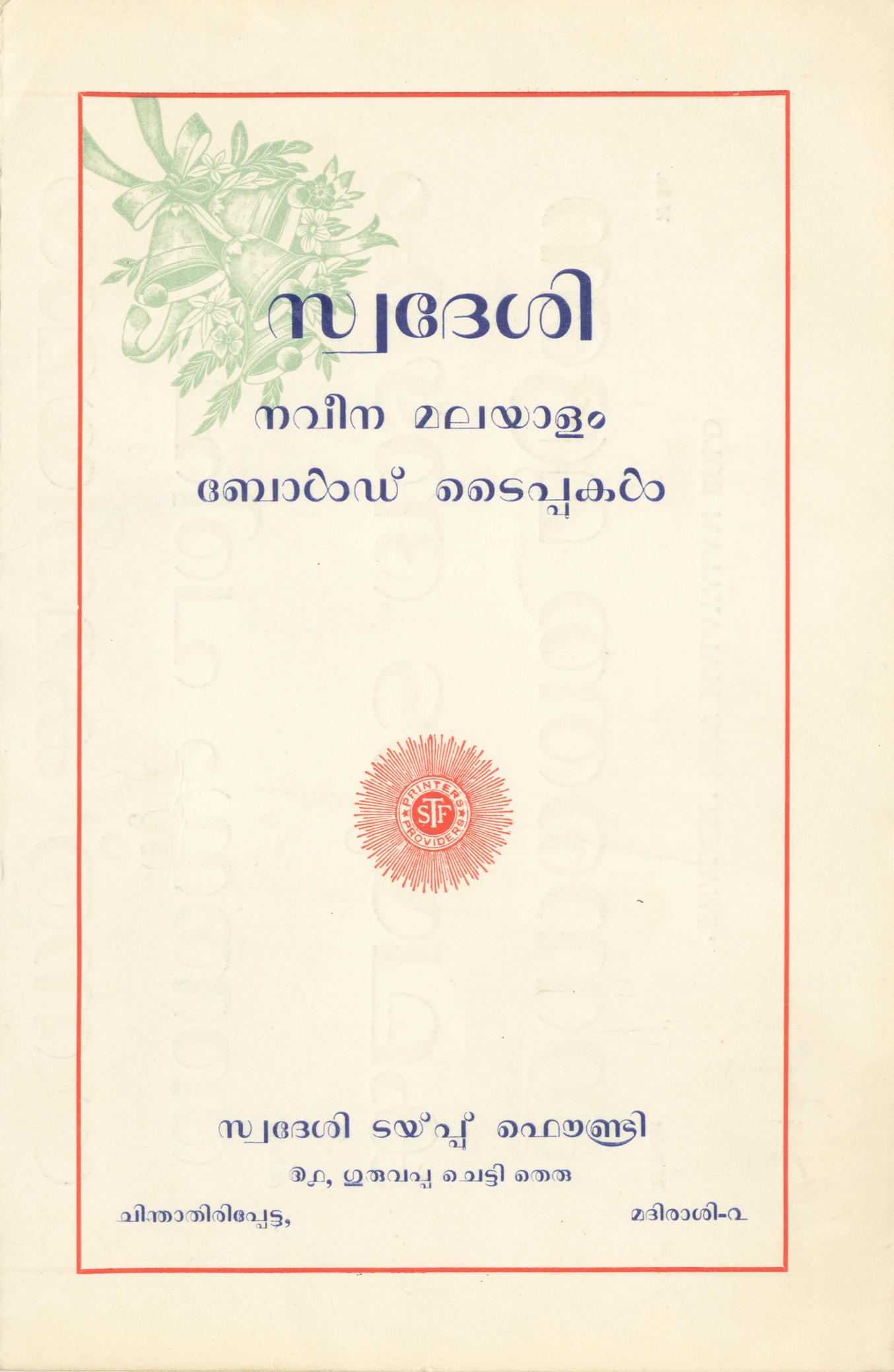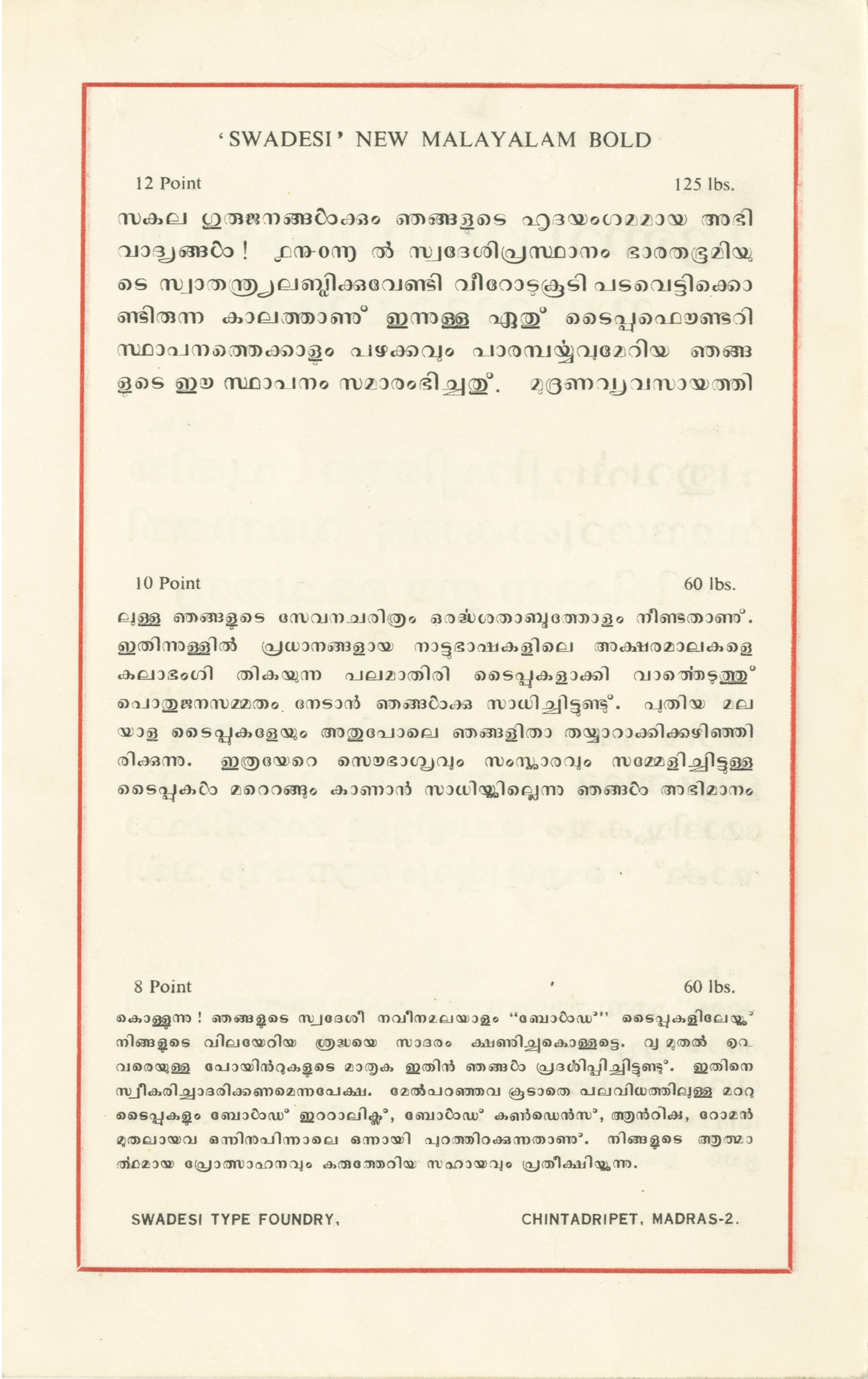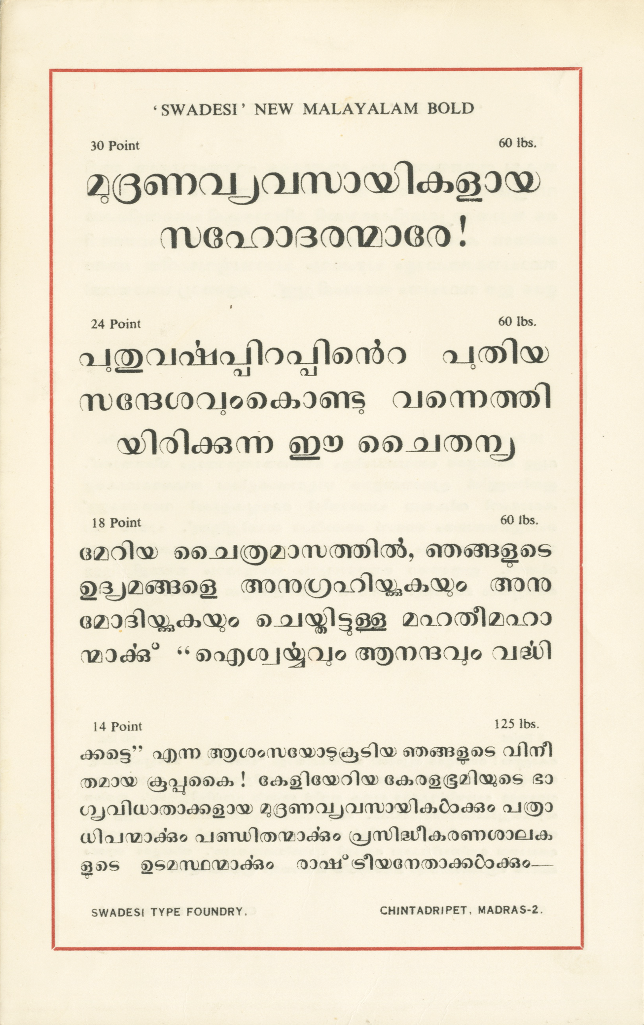 സ്വദേശി നവീന മലയാളം ബോൾഡ് ടൈപ്പുകൾ or Swadesi Naveen Malayalam Bold Typekal from the Swadesi Type Foundry showcases a Malayalam typeface named Swadesi New Malayalam Bold in various sizes, ranging from display to text. Malayalam is a language primarily spoken in Kerala, and its script has experienced some radical transformations.